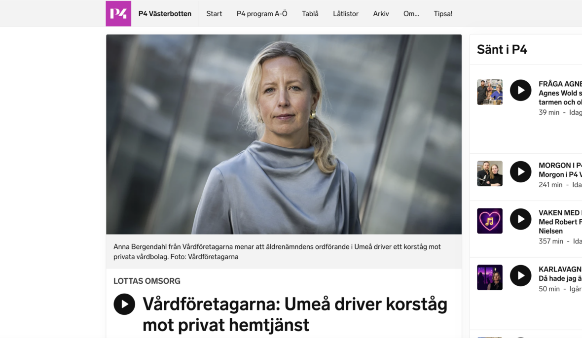 Anna Bergendal i intervju i P4 Västerbotten: ”Umeå driver korståg mot privat hemtjänst”