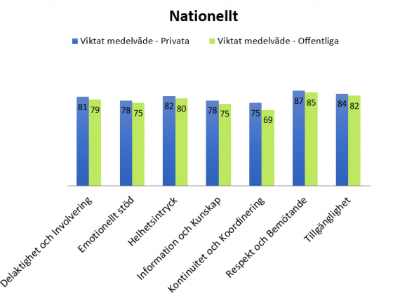 Vi redovisar de sammantagna medelvärdena för samtliga vårdcentraler i undersökningen, samt i respektive region, uppdelat på de olika kvalitetsparametrarna och regiform. Medelvärdena har viktats med avseende på vårdenhetens storlek. Detta för att inte riskera en snedvriden bild av verkligheten där flera små enheter med få svarande patienter påverkar resultatet mer än vad en större enhet med lika många svarande patienter som de små enheterna har totalt, gör. Viktningen baseras enbart på storleken på de aktuella vårdenheterna. Viktningen har utförts enligt följande: Aggregerat resultat för en kategori = summan av [antalet svar för aktuell enhet]*[enkätresultat för aktuell enhet] för alla enheter i en kategori/summan av [antalet svar] för alla enheter i samma kategori.