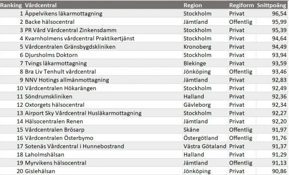 - 9 av 10 av de mest uppskattade vårdcentralerna i Stockholm är privat drivna.