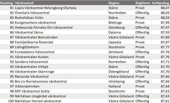 - 75 av de 100 vårdcentraler i Sverige som har mest nöjda patienter är privat drivna.