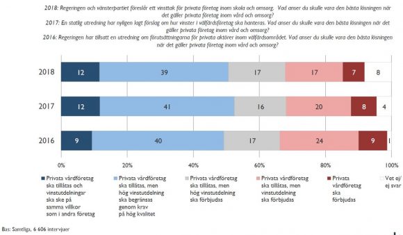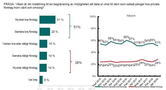 På Vårdföretagarnas uppdrag ställer Novus ungefär samma fråga en gång i kvartalet. I aprilmätningen ansåg 51 procent att det är ett bra förslag att begränsa vinstutdelning i vård och omsorg (Novus fråga rör allt så inte skola). 28 procent tyckte att det var ett dåligt förslag. Bland alliansväljarna ansåg 32 procent att vinstbegränsning var bra och 45 procent att en begränsning var dålig. Inte heller bland SD-väljarna fanns det en majoritet som var för en begränsning. 44 procent tyckte att vinstbegränsning är ett bra förslag.