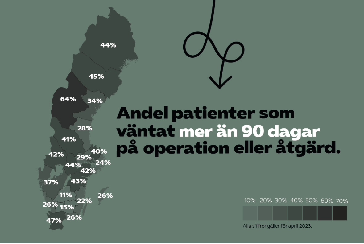 Totalt hade mer än 23 000 personer i Sverige i april 2023 stått i kö längre än ett år för att för att träffa en specialist för ett första möte. Samtidigt hade nästan 15 000 personer väntat i över ett år på en beslutad åtgärd/operation.