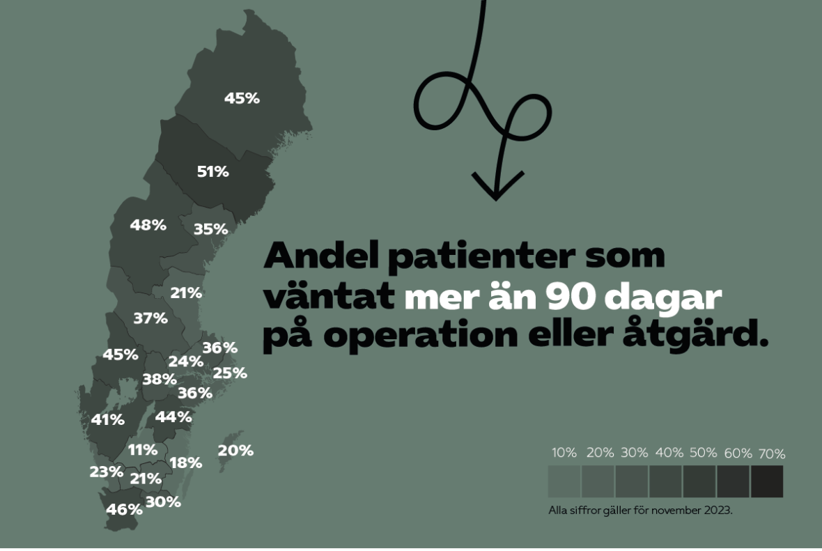 Under november månad hade drygt 3 400 personer väntat längre än 90 dagar på en gråstarrsoperation. Det motsvarade 22 procent av de totalt 15 600 som väntade på en gråstarrsoperation. Det var stora skillnader mellan regionerna i hur stor andel som har väntat längre än vårdgarantin. I fyra regioner hade över 30 procent väntat längre än 90 dagar.