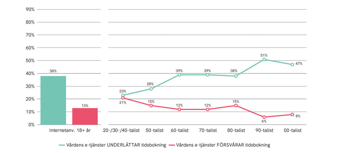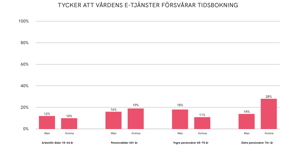 Pensionärer upplever oftare svårigheter med nya digitala kontaktvägar. Bland kvinnor äldre än 76 år tycker exempelvis 28 procent att e-tjänsterna försvårar tidsbokning (jämfört med 10 procent bland kvinnor 18–64). Samtidigt är gruppen äldre de som i lägst grad är uppkopplade, och nya vägar måste till för att även denna grupp ska kunna använda nya digitala lösningar.
