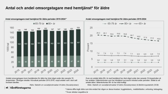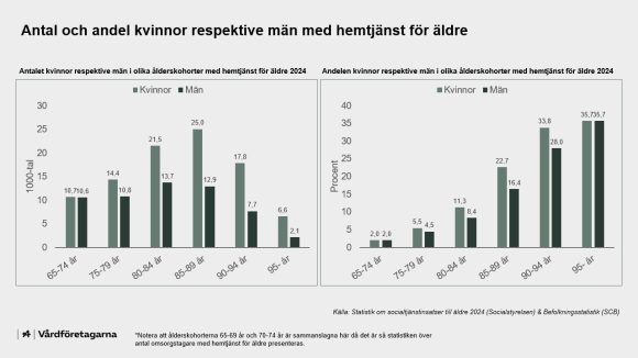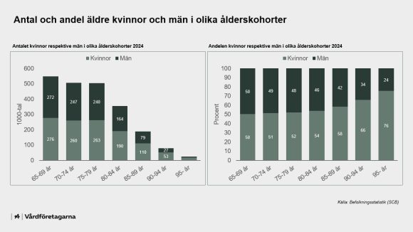 – Kvinnor lever längre och är därför i majoritet bland dem som behöver omsorg. Av de knappt 240 000 som bor på äldreboende eller har hemtjänst är två av tre kvinnor. Med allt fler äldre i befolkningen ökar behoven och trycket på äldreomsorgen kraftigt kommande år, säger Björn Arnek, branschekonom och analytiker, Vårdföretagarna.