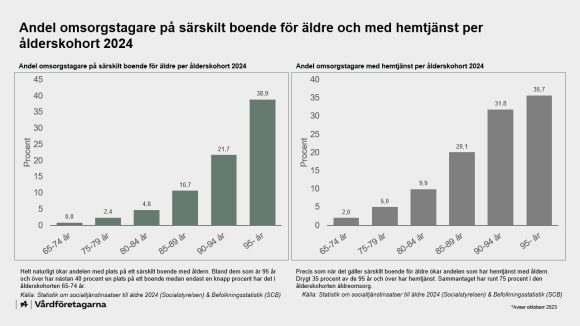 Bland dem som är 95 år och över har nästan 40 procent en plats på ett boende medan endast en knapp procent har det i ålderskohorten 65-74 år. Gällande hemtjänst har 35 procent av de 95 år och över hemtjänst. Sammantaget har runt 75 procent i den ålderskohorten äldreomsorg.