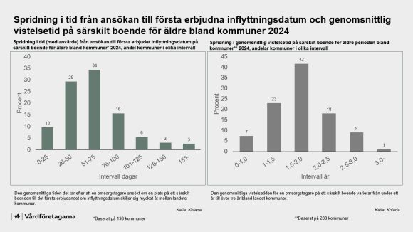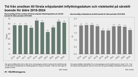 Den genomsnittliga tiden det tar efter att en omsorgstagare ansökt om plats på ett särskilt boende och fått ett första erbjudandet om inflyttningsdatum är drygt två månader. Den genomsnittliga vistelsetiden för en omsorgstagare på ett särskilt boende är drygt 1,5 år