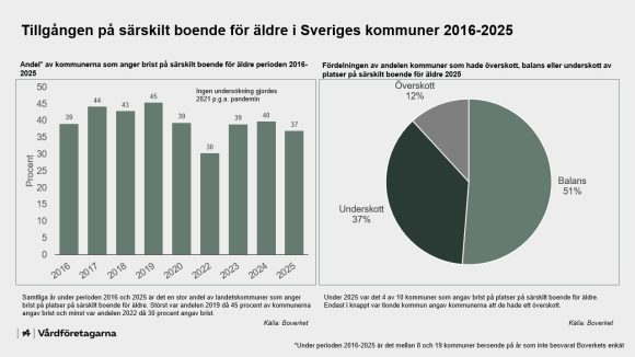 Under 2025 var det 4 av 10 kommuner som angav brist på platser på särskilt boende för äldre. Endast i knappt var tionde kommun angav kommunerna att de hade ett överskott.
