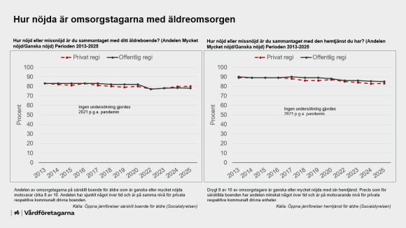 Andelen av omsorgstagarna med hemtjänst eller på särskilt boende för äldre som är ganska eller mycket nöjda motsvarar cirka 8 av 10. Andelen har sjunkit något över tid och är på samma nivå för privata respektive kommunalt utförare.