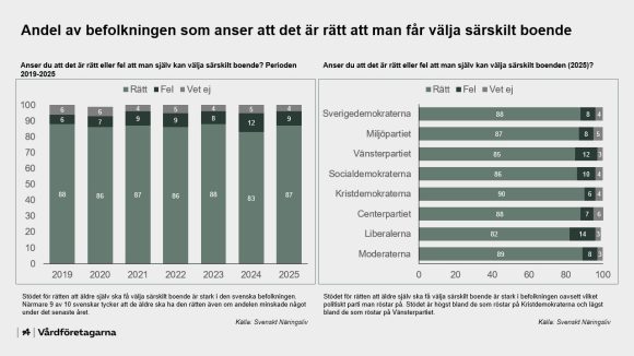 Stödet för rätten att äldre själv ska få välja särskilt boende är stark i den svenska befolkningen. Närmare 9 av 10 svenskar tycker att de äldre ska ha den rätten.