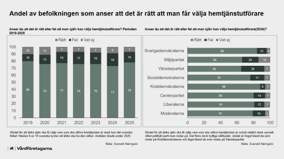 Stödet för att äldre själv ska få välja vem som ska utföra hemtjänsten är stark hos det svenska folket. Nästan 8 av 10 svenska tycker att äldre ska ha den rätten.