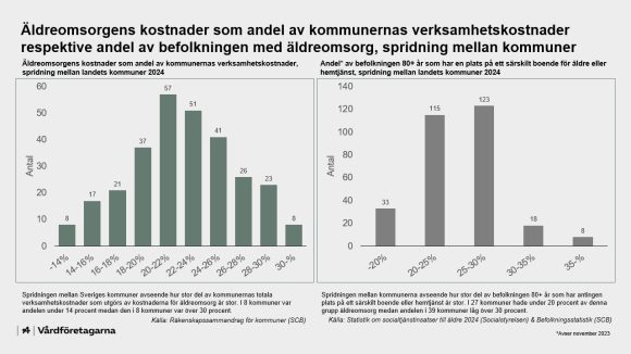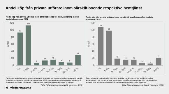 Det är stor spridning mellan landets kommuner avseende hur stor andel av kostnaderna för hemtjänst och särskilt boende som utgörs av köp från privata utförare.