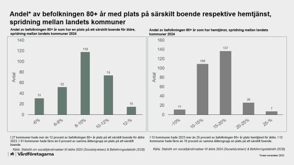 I de högsta åldrarna har runt 75 procent någon form av äldreomsorg, men tillgången varierar kraftigt mellan kommuner. I 27 kommuner har färre än 20 procent av befolkningen 80+ äldreomsorg, medan motsvarande andel i 39 kommuner ligger över 30 procent.