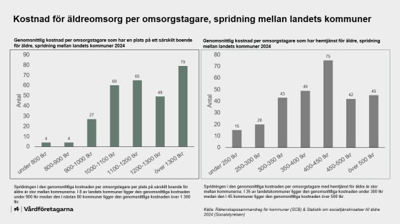 Spridningen i den genomsnittliga kostnaden per omsorgstagare per plats på särskilt boende för äldre är stor mellan kommunerna. Detsamma gäller spridningen i den genomsnittliga kostnaden för hemtjänst mellan kommuner.