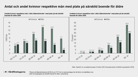 Av de 84 400 äldre som hade plats på ett särskilt boende i oktober 2024 var 55 000, motsvarande 65 procent kvinnor. Av de 154 000 äldre som hade hemtjänst var närmare 96 000, motsvarande 62 procent, kvinnor.