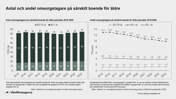 Kombinationen mellan färre omsorgstagare i gruppen 80+ år och en ökning i samma ålderskohort med närmare 30 procent har inneburit att andelen i gruppen 80+ år som har en plats på ett boende har minskat från 12,9 procent till 9,9 procent.