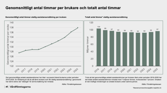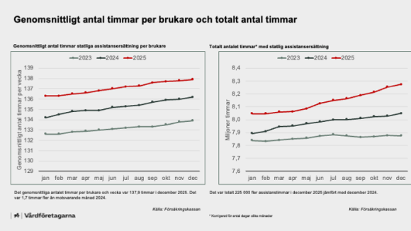 Sammantaget innebar detta att det totala antalet statliga assistanstimmar ökade för andra året i följd från 94,5 miljoner timmar 2024 till drygt 97 miljoner timmar 2025.