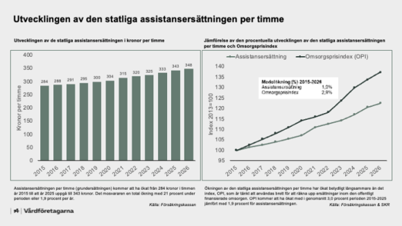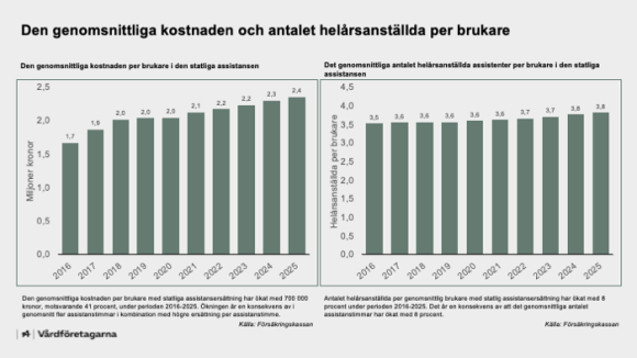 Den totala kostnaden för den statliga assistansen steg med en dryg miljard kronor under 2025. Men med hänsyn till kostnadsutvecklingen* och antagandet om oförändrad produktivitet så sjunker den reala ersättningen per assistanstimme med en dryg procent.