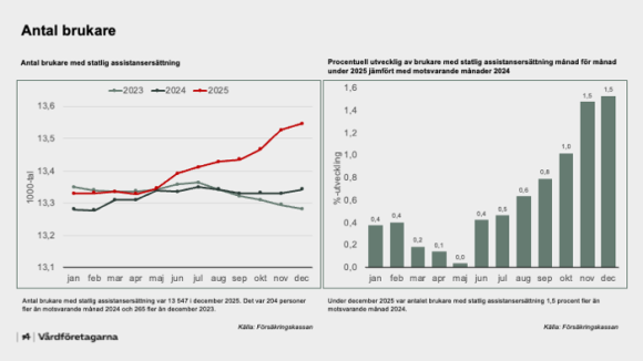 Antalet personer med rätt till personlig assistans ökade under 2025. Det är ett trendbrott och för första gången sedan 2013 ökar antalet brukare. Nästan hela ökningen finns inom gruppen under 20 år, medan antalet äldre med assistans fortsatte att minska fram till årets sista månader. Den ekonomiska situationen fortsatte att försämras, trots en något högre höjning av schablonersättningen.