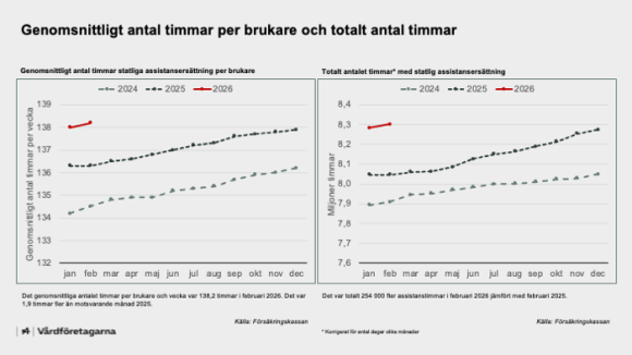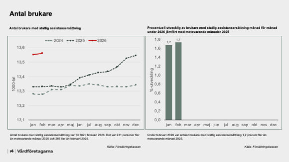 Antalet med assistansersättning ligger högre i februari 2026 än 2024 och 2025.
