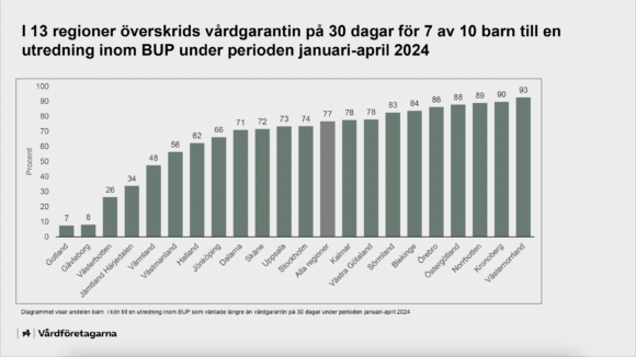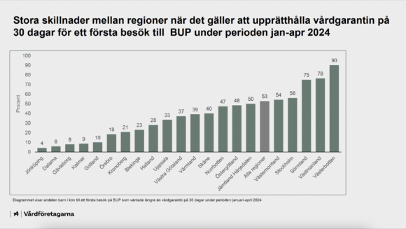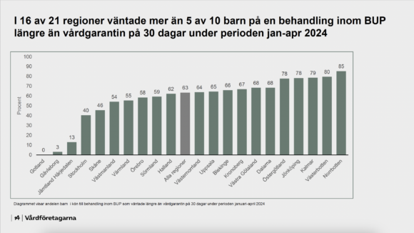 Inom fem regioner var andelen som fick vänta längre än vårdgarantin på en behandling inom BUP runt 80 procent; Region Västerbotten, Region Jönköping, Region Kalmar, Region Östergötland och Region Norrbotten.