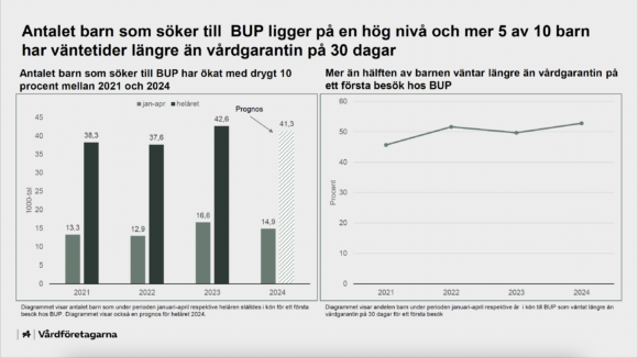Över 50 procent av barnen som söker sig till BUP får vänta i kön längre än vårdgarantin på 30 dagar på sitt första besök. Andelen hittills under 2024 är den högsta under åren 2021-2024.