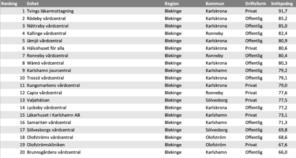 - Av Blekinges 20 mest uppskattade vårdcentraler är 7 privat drivna.