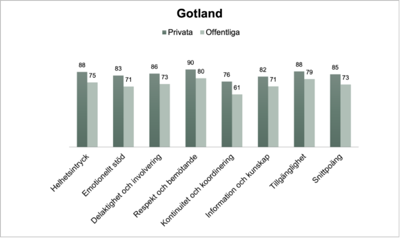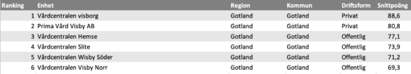 - På Gotland är 6 vårdcentraler med i undersökningen, varav 2 är privat drivna. Det motsvarar 33 procent av vårdcentralerna.