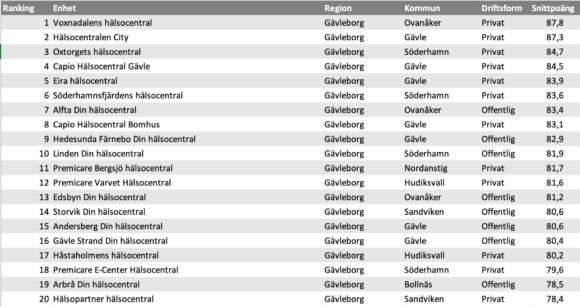 - Av Gävleborgs 20 mest uppskattade vårdcentraler är 12 privat drivna.