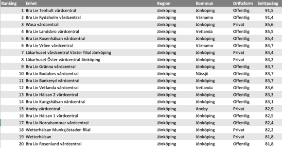 - Av Jönköpings 20 mest uppskattade vårdcentraler är 6 privat drivna.