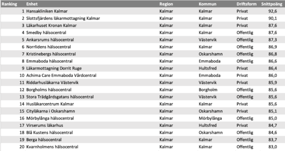 - Av Kalmars 20 mest uppskattade vårdcentraler är nio privat drivna.