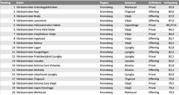 - Av Kronobergs 20 mest uppskattade vårdcentraler är nio privat drivna.