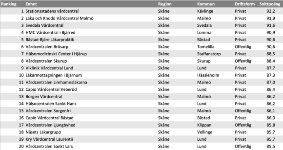- Av Skånes 20 mest uppskattade vårdcentraler är 15 privat drivna.