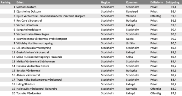- Av Stockholms 20 mest uppskattade vårdcentraler är 17 privat drivna.