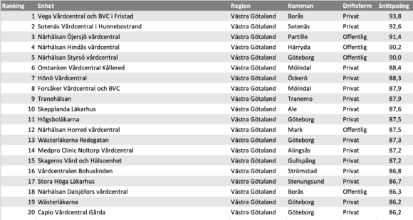 - Av Västra Götalands 20 mest uppskattade vårdcentraler är 15 privat drivna.