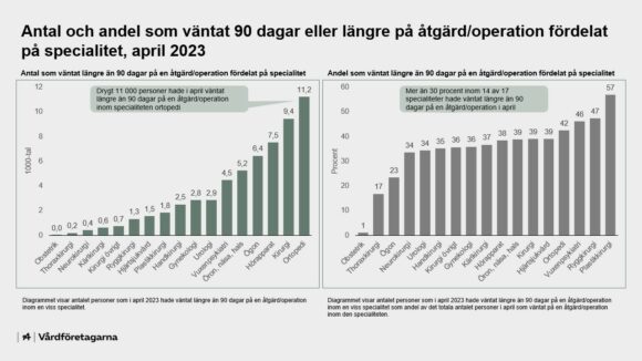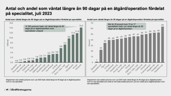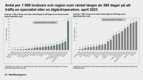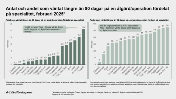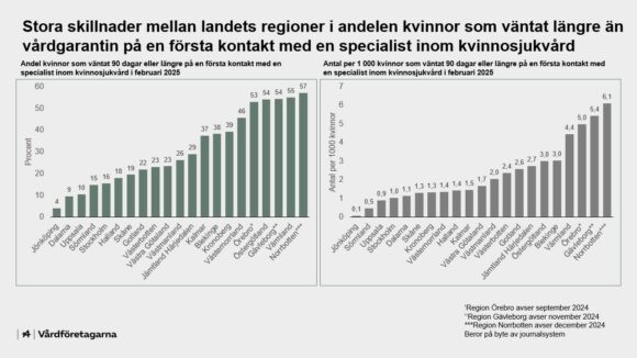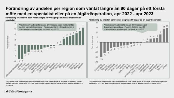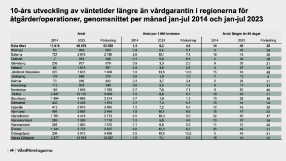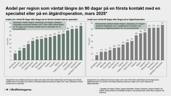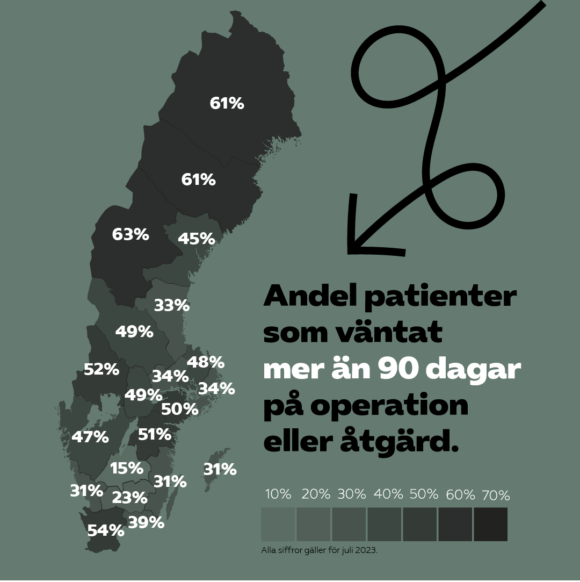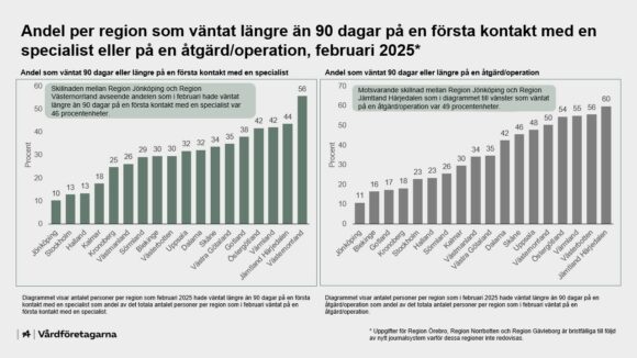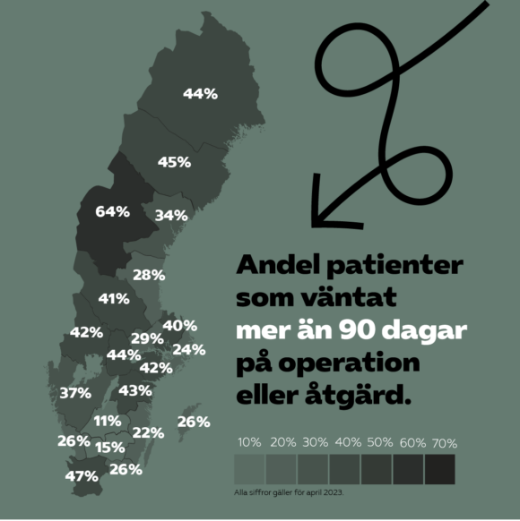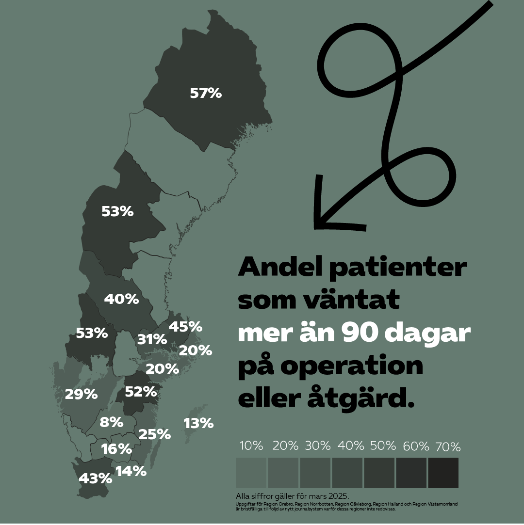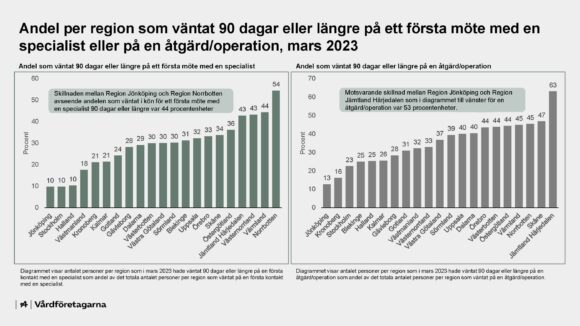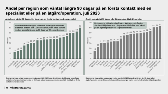 I tre regioner har fler än hälften av de som väntar på operation/åtgärd, väntat längre än vårdgarantins tidsramar (mer än 90 dagar). De regionala skillnaderna är också stora. Andelen som väntat mer än 90 dagar på operation/åtgärd i specialistvården varierar mellan 14 % i Region Jönköpings län, och 62 % i Region Jämtland Härjedalen. Bland de tre största regionerna är det Stockholm som har lägst andel patienter som väntat längre än vårdgarantins tidsramar (25 %) och Region Skåne störst andel (48 %).