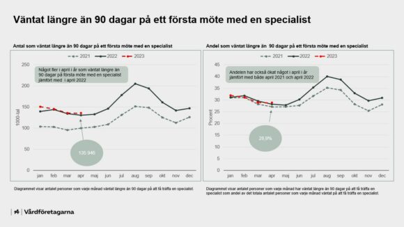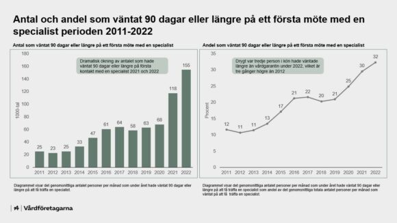 Antal och andel som väntat 90 dagar eller längre på ett första möte med en specialist och på en åtgärd/operation har ökat sedan 2011.