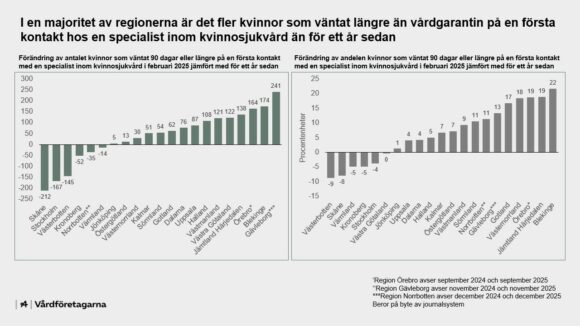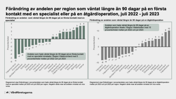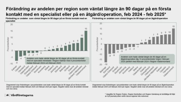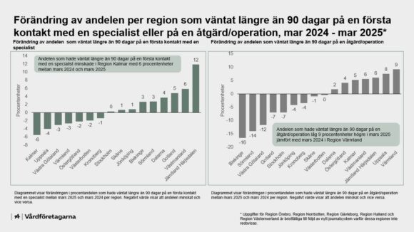 Förändringen av andelen per region som väntat 90 dagar eller längre på ett första möte med en specialist eller på en åtgärd/operation augusti 2025 jämfört med samma månad 2024 varierar mellan olika delar av Sverige.