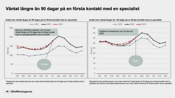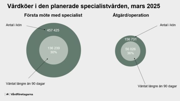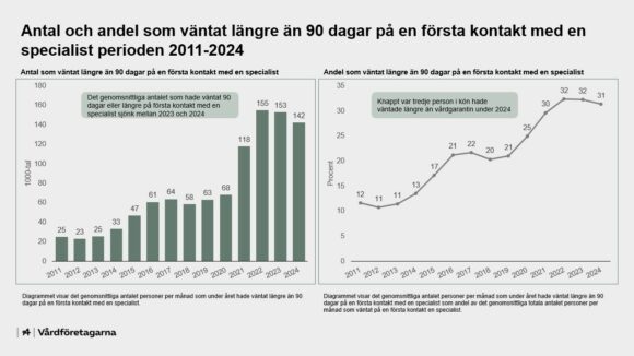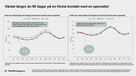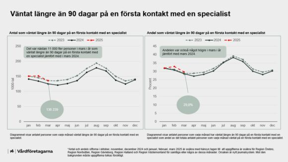 Antalet som har väntat 90 dagar eller längre på ett första möte med en specialist, 179 706, är fler i september i år jämfört med samma månad 2024. Andelen är är högre i september i år, 37,8 %, jämfört med samma månad 2024.