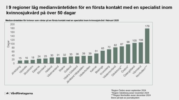 Februari – Skillnader mellan regioner i uppfyllande av vårdgarantin för första kontakt med en specialist inom kvinnosjukvård i februari 2025