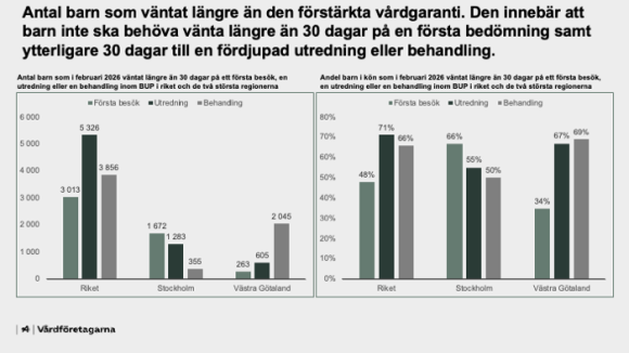 I riket totalt hade i februari 2026 drygt 3 000 barn väntat längre än den förstärkta vårdgarantin på ett första besök på BUP, ytterligare drygt 5 300 på en utredning och cirka 3 860 på en behandling.